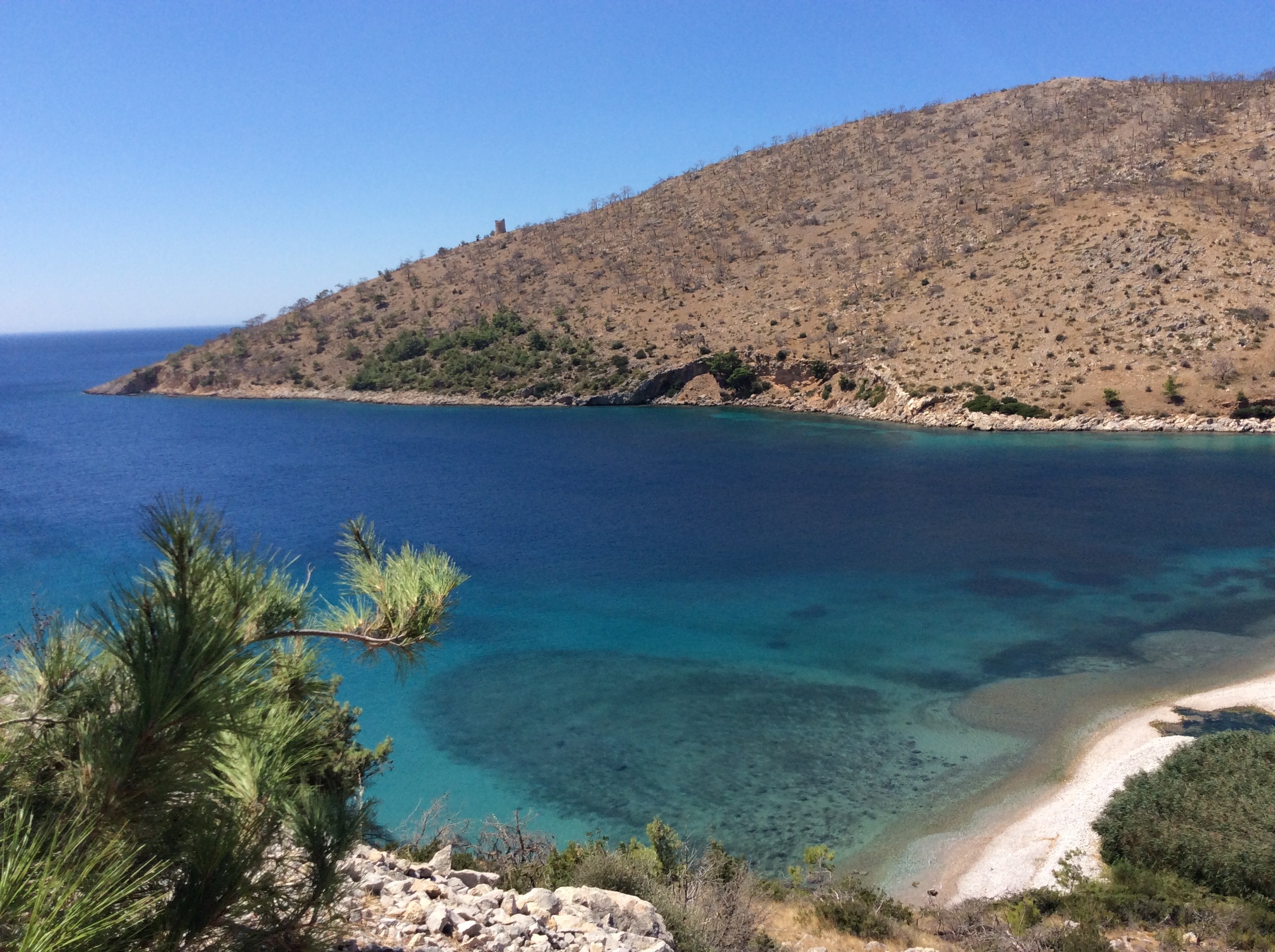 Batı kıyısına vardığınız zaman ıssız koylar sizi bekliyor olacak. Öyleki, bizim bulduğumuz Elinda koyunda, ki oldukça büyük bir koydu, sadece biz vardık. Sonradan 2 aile daha geldi. Adanın bazı koylarında, bizdeki beach clublara benzer, ama öyle lüks olmayan işletmeler var. bu işletmeler size şezlong sağlıyorlar. öte taraftan, Elinda gibi koylarda kendi başınızın çaresine bakmanız gerekir. İşletmesiz koyları, hazır halen varken, tavsiye ederim. Deniz suyu görece soğuk, ama alışması kolay. Adanın bu noktasında sahil bembeyaz çakıllardan oluşuyor. Bu muhteşem koydan ayrılmamız oldukça zor oldu. 🙂